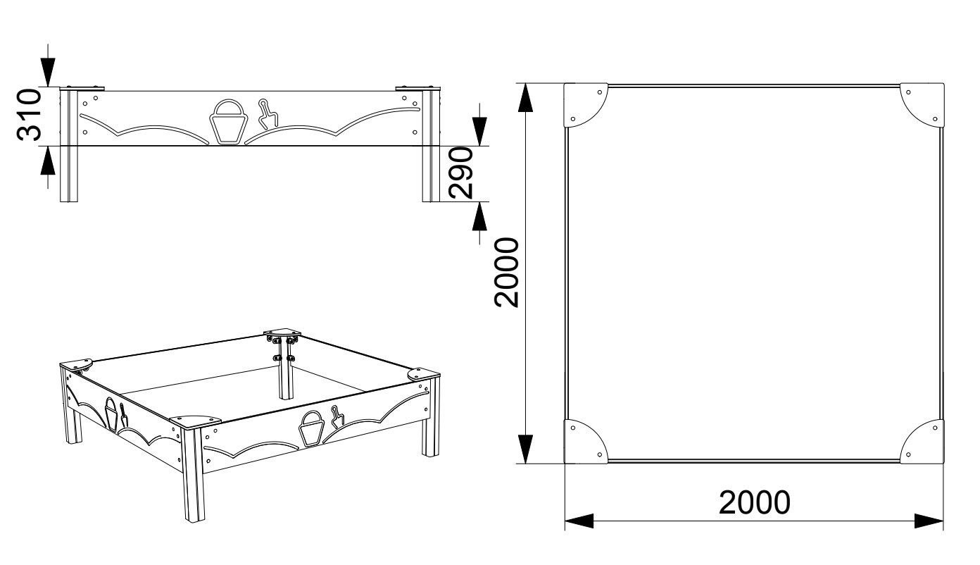 Kvadratni pješčanik dimenzija 2000 × 2000 × 310 mm izrađen od aluminijskih profila i HDPE plastike s ugraviranim dječjim motivima. U kutovima se nalaze ojačanja koja služe kao sjedišta za djecu i roditelje. Proizvod je otporan na vremenske uvjete, ne zahtijeva održavanje i dizajniran je kao antivandal. Pogodan za djecu od 2 do 9 godina.