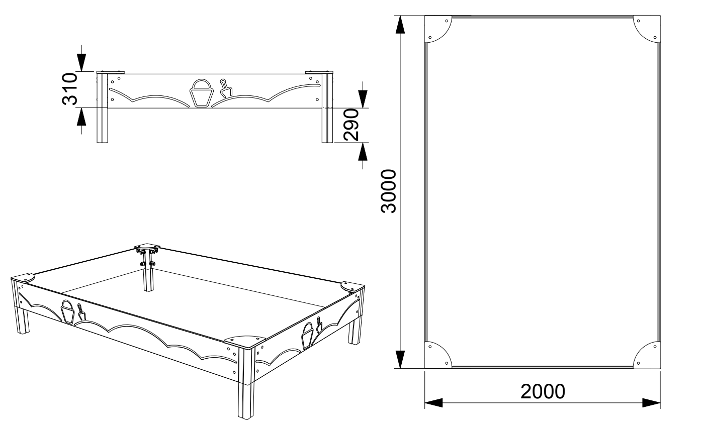 Pješčanik dimenzija 3000 × 2000 × 310 mm izrađen je od aluminijskih potpornih stupova i HDPE plastičnih bočnih stranica s ugraviranim dječjim motivima. U kutovima se nalaze pojačanja koja služe kao sjedala za djecu ili roditelje. Konstrukcija je otporna na vremenske uvjete, ne zahtijeva održavanje i dizajnirana je kao antivandal. Pogodan je za vanjsku upotrebu, s kritičnom visinom pada od 300 mm i sigurnosnom zonom od 6000 × 5000 mm. Namijenjen djeci u dobi od 2 do 9 godina.