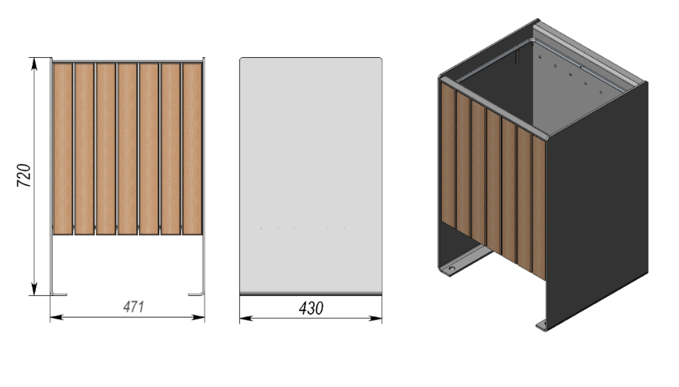 Vanjska kanta za otpad bez poklopca izrađena je od čvrste čelične konstrukcije s borovim letvicama. Jednostavna je za zamjenu vreća, a noge se mogu učvrstiti vijcima ili betoniranjem. Zahvaljujući antikorozivnoj zaštiti i kvalitetnoj površinskoj obradi, pogodna je za javne, parkovne i urbane prostore.