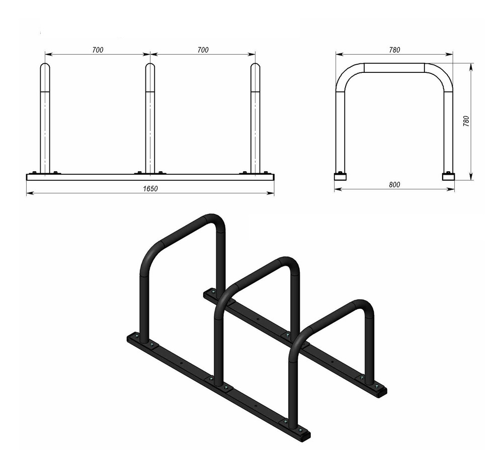 Stalak za bicikle s tri stanice omogućuje uredno i praktično parkiranje većeg broja bicikala na javnim površinama. Konstrukcija je izrađena od izdržljivog čeličnog okvira otpornog na habanje i vanjske uvjete, dok povezani moduli osiguravaju stabilnost i dugotrajnu upotrebu. Namijenjen je parkovima, školama, sportskim terenima i urbanim prostorima.