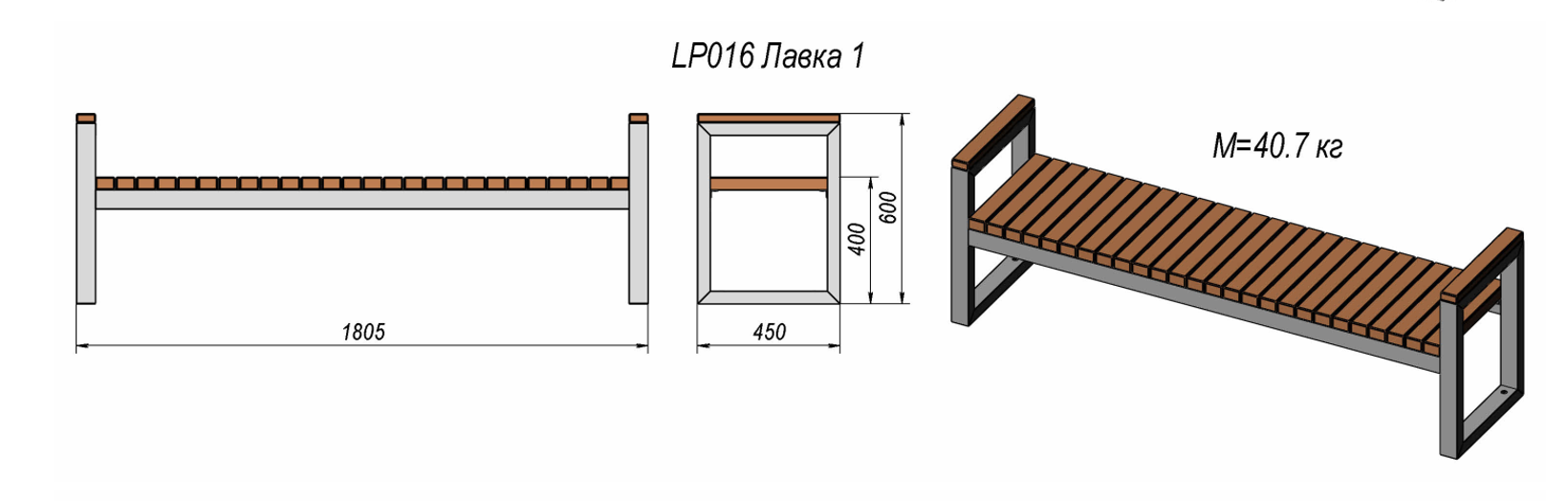 Klupa „LP016“ izrađena je od čvrste čelične konstrukcije s antikorozivnom zaštitom i letvica od borovog drva. Površinski je obrađena praškastim lakom i namijenjena za ugradnju u parkovne i urbane prostore. Noge se mogu sidriti vijcima ili betoniranjem.