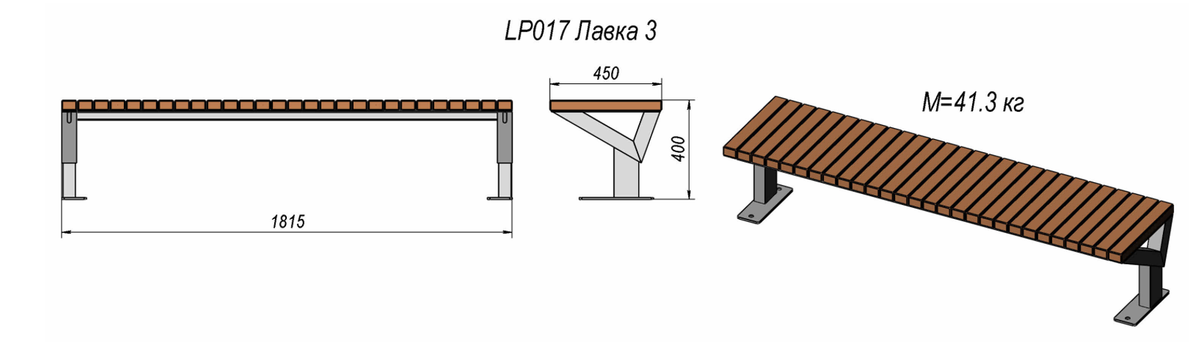 Klupa „LP017“ izrađena je od čelične konstrukcije s antikorozivnom zaštitom i letvica od borovog drva. Površinski je obrađena praškastim lakom i namijenjena za ugradnju u parkovne i urbane prostore. Noge se mogu sidriti vijcima ili betoniranjem.