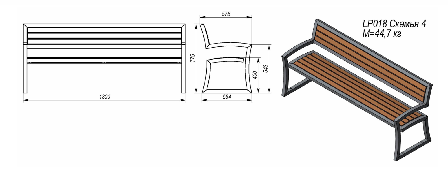 Klupa „LP018“ izrađena je od čelične konstrukcije tretirane antikorozivnom zaštitom i letvica od borovog drva. Površinski je obrađena praškastim lakom i pogodna za ugradnju u parkovne i urbane prostore. Noge se mogu sidriti vijcima ili betoniranjem .
