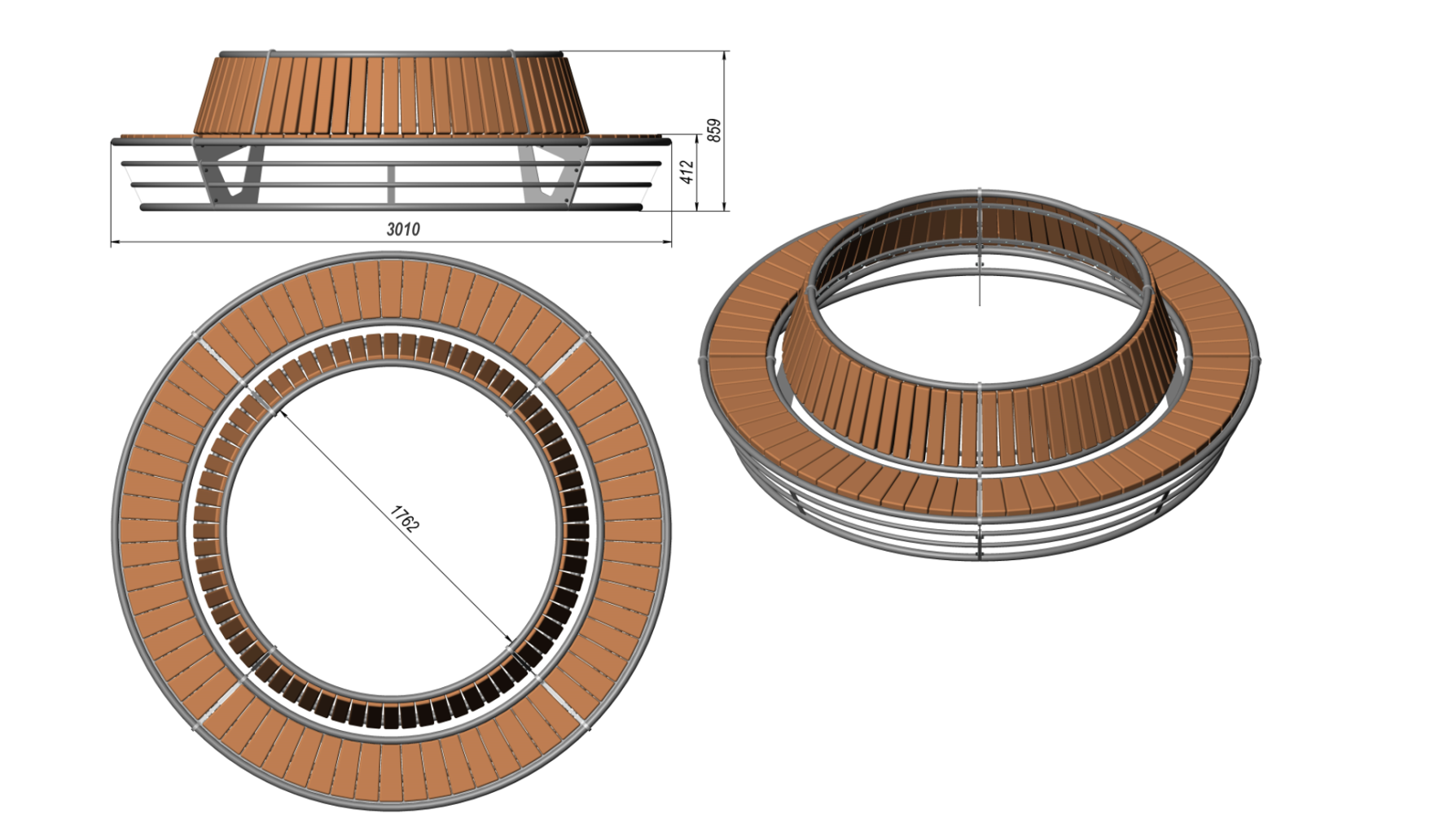 Kružna klupa „LP034“ izrađena je od čelične konstrukcije s antikorozivnom zaštitom i letvica od borovog drva. Površinski je obrađena praškastim lakom i namijenjena ugradnji u parkovne i urbane prostore .